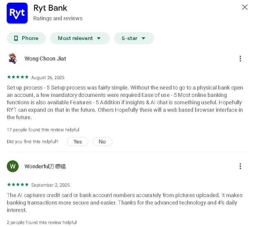 - Lowyat.net: “The AI assistant isn’t perfect yet, but the onboarding process is one of the fastest we’ve tested in Malaysia.” (Source: https://www.lowyat.net/2025/319670/ryt-bank-review-hands-on-ai-first-digital-bank/)
